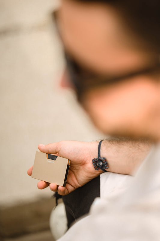 Este tarjetero no tradicional, cuenta con un bloqueo de información RFID que protege tus datos de cualquier intento de robo de información. Cada modelo incluye un money clip de acero 100% inoxidable para guardar tus billetes.